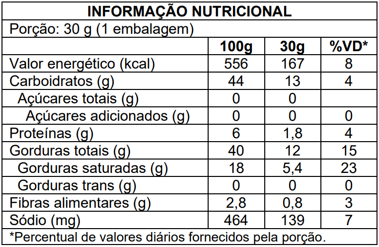 Batata, óleo vegetal, sal refinado e realçador de sabor glutamato monossódico.